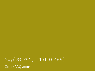 Yxy 28.791,0.431,0.489 Color is a normal yellow color and the nearest color is Dark Yellow #9b870c. Hex code #a19410 and RGB value is rgb(161,148,16). In RGB color space, this color is composed of 63% red, 58% green, 6% blue, In CMYK color space, this color is composed of 0% cyan, 8% magenta, 90% yellow , 37% black , In HSL color space, this color has a hue angle of 55° , 82% saturation and 35% lightness.