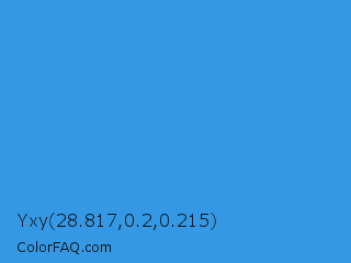 Yxy 28.817,0.2,0.215 Color is a normal blue color and the nearest color is Bleu De France #318ce7. Hex code #3498e5 and RGB value is rgb(52,152,229). In RGB color space, this color is composed of 20% red, 60% green, 90% blue, In CMYK color space, this color is composed of 77% cyan, 34% magenta, 0% yellow , 10% black , In HSL color space, this color has a hue angle of 206° , 77% saturation and 55% lightness.