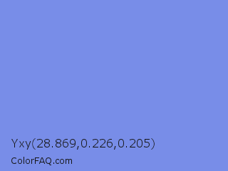Yxy 28.869,0.226,0.205 Color is a light blue color and the nearest color is Cornflower Blue #6495ed. Hex code #788de8 and RGB value is rgb(120,141,232). In RGB color space, this color is composed of 47% red, 55% green, 91% blue, In CMYK color space, this color is composed of 48% cyan, 39% magenta, 0% yellow , 9% black , In HSL color space, this color has a hue angle of 229° , 71% saturation and 69% lightness.