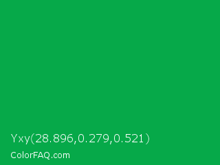 Yxy 28.896,0.279,0.521 Color is a normal green color and the nearest color is Green Pantone #00ad43. Hex code #06a949 and RGB value is rgb(6,169,73). In RGB color space, this color is composed of 2% red, 66% green, 29% blue, In CMYK color space, this color is composed of 96% cyan, 0% magenta, 57% yellow , 34% black , In HSL color space, this color has a hue angle of 145° , 93% saturation and 34% lightness.
