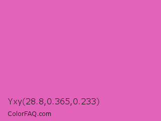 Yxy 28.8,0.365,0.233 Color is a light magenta color and the nearest color is Sky Magenta #cf71af. Hex code #e363ba and RGB value is rgb(227,99,186). In RGB color space, this color is composed of 89% red, 39% green, 73% blue, In CMYK color space, this color is composed of 0% cyan, 56% magenta, 18% yellow , 11% black , In HSL color space, this color has a hue angle of 319° , 70% saturation and 64% lightness.