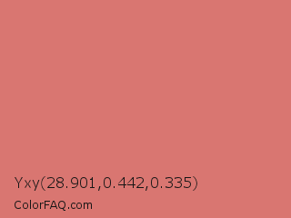 Yxy 28.901,0.442,0.335 Color is a light red color and the nearest color is Candy Pink #e4717a. Hex code #d97671 and RGB value is rgb(217,118,113). In RGB color space, this color is composed of 85% red, 46% green, 44% blue, In CMYK color space, this color is composed of 0% cyan, 46% magenta, 48% yellow , 15% black , In HSL color space, this color has a hue angle of 3° , 58% saturation and 65% lightness.
