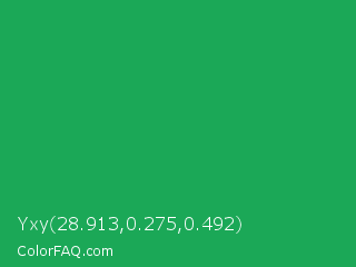 Yxy 28.913,0.275,0.492 Color is a normal green color and the nearest color is Green Pigment #00a550. Hex code #1ba857 and RGB value is rgb(27,168,87). In RGB color space, this color is composed of 11% red, 66% green, 34% blue, In CMYK color space, this color is composed of 84% cyan, 0% magenta, 48% yellow , 34% black , In HSL color space, this color has a hue angle of 146° , 72% saturation and 38% lightness.