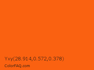 Yxy 28.914,0.572,0.378 Color is a normal orange color and the nearest color is Giants Orange #fe5a1d. Hex code #fa6111 and RGB value is rgb(250,97,17). In RGB color space, this color is composed of 98% red, 38% green, 7% blue, In CMYK color space, this color is composed of 0% cyan, 61% magenta, 93% yellow , 2% black , In HSL color space, this color has a hue angle of 21° , 96% saturation and 52% lightness.