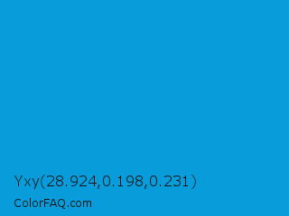 Yxy 28.924,0.198,0.231 Color is a normal blue color and the nearest color is Cerulean #02a4d3. Hex code #089cdb and RGB value is rgb(8,156,219). In RGB color space, this color is composed of 3% red, 61% green, 86% blue, In CMYK color space, this color is composed of 96% cyan, 29% magenta, 0% yellow , 14% black , In HSL color space, this color has a hue angle of 198° , 93% saturation and 45% lightness.