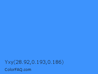 Yxy 28.92,0.193,0.186 Color is a light blue color and the nearest color is Brilliant Azure #3399ff. Hex code #3d93fd and RGB value is rgb(61,147,253). In RGB color space, this color is composed of 24% red, 58% green, 99% blue, In CMYK color space, this color is composed of 76% cyan, 42% magenta, 0% yellow , 1% black , In HSL color space, this color has a hue angle of 213° , 98% saturation and 62% lightness.