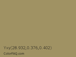 Yxy 28.932,0.376,0.402 Color is a normal yellow color and the nearest color is Barley Corn #a68b5b. Hex code #a09263 and RGB value is rgb(160,146,99). In RGB color space, this color is composed of 63% red, 57% green, 39% blue, In CMYK color space, this color is composed of 0% cyan, 9% magenta, 38% yellow , 37% black , In HSL color space, this color has a hue angle of 46° , 24% saturation and 51% lightness.