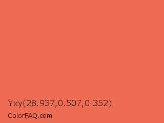 Yxy 28.937,0.507,0.352 Color is a light red color and the nearest color is Burnt Sienna #e97451. Hex code #ed6a53 and RGB value is rgb(237,106,83). In RGB color space, this color is composed of 93% red, 42% green, 33% blue, In CMYK color space, this color is composed of 0% cyan, 55% magenta, 65% yellow , 7% black , In HSL color space, this color has a hue angle of 9° , 81% saturation and 63% lightness.