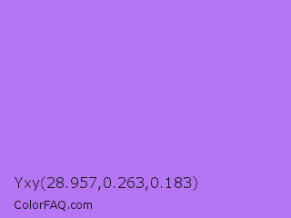 Yxy 28.957,0.263,0.183 Color is a light purple color and the nearest color is Lavender #b57edc. Hex code #b675f2 and RGB value is rgb(182,117,242). In RGB color space, this color is composed of 71% red, 46% green, 95% blue, In CMYK color space, this color is composed of 25% cyan, 52% magenta, 0% yellow , 5% black , In HSL color space, this color has a hue angle of 271° , 83% saturation and 70% lightness.