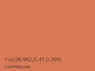 Yxy 28.962,0.47,0.369 Color is a normal orange color and the nearest color is Japonica #d87c63. Hex code #d87957 and RGB value is rgb(216,121,87). In RGB color space, this color is composed of 85% red, 47% green, 34% blue, In CMYK color space, this color is composed of 0% cyan, 44% magenta, 60% yellow , 15% black , In HSL color space, this color has a hue angle of 16° , 62% saturation and 59% lightness.