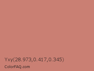 Yxy 28.973,0.417,0.345 Color is a light red color and the nearest color is Contessa #c6726b. Hex code #ca7f73 and RGB value is rgb(202,127,115). In RGB color space, this color is composed of 79% red, 50% green, 45% blue, In CMYK color space, this color is composed of 0% cyan, 37% magenta, 43% yellow , 21% black , In HSL color space, this color has a hue angle of 8° , 45% saturation and 62% lightness.