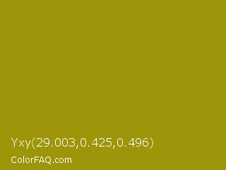 Yxy 29.003,0.425,0.496 Color is a normal yellow color and the nearest color is Dark Yellow #9b870c. Hex code #9d960b and RGB value is rgb(157,150,11). In RGB color space, this color is composed of 62% red, 59% green, 4% blue, In CMYK color space, this color is composed of 0% cyan, 4% magenta, 93% yellow , 38% black , In HSL color space, this color has a hue angle of 57° , 87% saturation and 33% lightness.