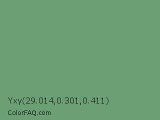 Yxy 29.014,0.301,0.411 Color is a normal green color and the nearest color is Aqua Forest #5fa777. Hex code #699f72 and RGB value is rgb(105,159,114). In RGB color space, this color is composed of 41% red, 62% green, 45% blue, In CMYK color space, this color is composed of 34% cyan, 0% magenta, 28% yellow , 38% black , In HSL color space, this color has a hue angle of 130° , 22% saturation and 52% lightness.