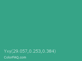 Yxy 29.057,0.253,0.384 Color is a normal cyan color and the nearest color is Zomp #39a78e. Hex code #36a487 and RGB value is rgb(54,164,135). In RGB color space, this color is composed of 21% red, 64% green, 53% blue, In CMYK color space, this color is composed of 67% cyan, 0% magenta, 18% yellow , 36% black , In HSL color space, this color has a hue angle of 164° , 50% saturation and 43% lightness.