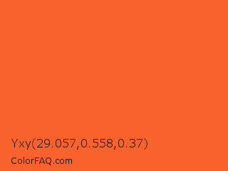 Yxy 29.057,0.558,0.37 Color is a normal orange color and the nearest color is Outrageous Orange Crayola #ff6037. Hex code #f9622c and RGB value is rgb(249,98,44). In RGB color space, this color is composed of 98% red, 38% green, 17% blue, In CMYK color space, this color is composed of 0% cyan, 61% magenta, 82% yellow , 2% black , In HSL color space, this color has a hue angle of 16° , 94% saturation and 57% lightness.