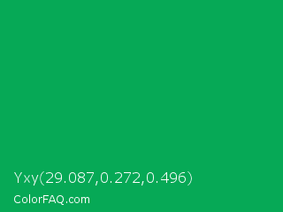 Yxy 29.087,0.272,0.496 Color is a normal green color and the nearest color is Green Pigment #00a550. Hex code #06a956 and RGB value is rgb(6,169,86). In RGB color space, this color is composed of 2% red, 66% green, 34% blue, In CMYK color space, this color is composed of 96% cyan, 0% magenta, 49% yellow , 34% black , In HSL color space, this color has a hue angle of 149° , 93% saturation and 34% lightness.
