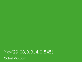 Yxy 29.08,0.314,0.545 Color is a normal green color and the nearest color is Apple #4fa83d. Hex code #44a730 and RGB value is rgb(68,167,48). In RGB color space, this color is composed of 27% red, 65% green, 19% blue, In CMYK color space, this color is composed of 59% cyan, 0% magenta, 71% yellow , 35% black , In HSL color space, this color has a hue angle of 110° , 55% saturation and 42% lightness.