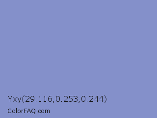 Yxy 29.116,0.253,0.244 Color is a light blue color and the nearest color is Dark Pastel Blue #779ecb. Hex code #8490ca and RGB value is rgb(132,144,202). In RGB color space, this color is composed of 52% red, 56% green, 79% blue, In CMYK color space, this color is composed of 35% cyan, 29% magenta, 0% yellow , 21% black , In HSL color space, this color has a hue angle of 230° , 40% saturation and 65% lightness.