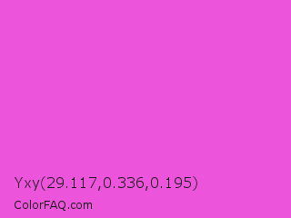 Yxy 29.117,0.336,0.195 Color is a light magenta color and the nearest color is Purple Pizzazz #fe4eda. Hex code #eb54db and RGB value is rgb(235,84,219). In RGB color space, this color is composed of 92% red, 33% green, 86% blue, In CMYK color space, this color is composed of 0% cyan, 64% magenta, 7% yellow , 8% black , In HSL color space, this color has a hue angle of 306° , 79% saturation and 63% lightness.