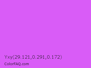 Yxy 29.121,0.291,0.172 Color is a light purple color and the nearest color is Heliotrope #df73ff. Hex code #d95cf7 and RGB value is rgb(217,92,247). In RGB color space, this color is composed of 85% red, 36% green, 97% blue, In CMYK color space, this color is composed of 12% cyan, 63% magenta, 0% yellow , 3% black , In HSL color space, this color has a hue angle of 288° , 91% saturation and 66% lightness.