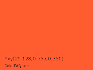 Yxy 29.128,0.565,0.361 Color is a normal red color and the nearest color is Portland Orange #ff5a36. Hex code #ff5c30 and RGB value is rgb(255,92,48). In RGB color space, this color is composed of 100% red, 36% green, 19% blue, In CMYK color space, this color is composed of 0% cyan, 64% magenta, 81% yellow , 0% black , In HSL color space, this color has a hue angle of 13° , 100% saturation and 59% lightness.