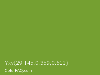 Yxy 29.145,0.359,0.511 Color is a normal green color and the nearest color is Palm Leaf #6f9940. Hex code #75a031 and RGB value is rgb(117,160,49). In RGB color space, this color is composed of 46% red, 63% green, 19% blue, In CMYK color space, this color is composed of 27% cyan, 0% magenta, 69% yellow , 37% black , In HSL color space, this color has a hue angle of 83° , 53% saturation and 41% lightness.