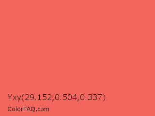 Yxy 29.152,0.504,0.337 Color is a light red color and the nearest color is Carnation #f95a61. Hex code #f3655d and RGB value is rgb(243,101,93). In RGB color space, this color is composed of 95% red, 40% green, 36% blue, In CMYK color space, this color is composed of 0% cyan, 58% magenta, 62% yellow , 5% black , In HSL color space, this color has a hue angle of 3° , 86% saturation and 66% lightness.