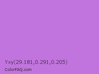 Yxy 29.181,0.291,0.205 Color is a light purple color and the nearest color is Lavender #b57edc. Hex code #c174dd and RGB value is rgb(193,116,221). In RGB color space, this color is composed of 76% red, 45% green, 87% blue, In CMYK color space, this color is composed of 13% cyan, 48% magenta, 0% yellow , 13% black , In HSL color space, this color has a hue angle of 284° , 61% saturation and 66% lightness.