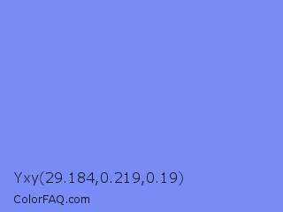 Yxy 29.184,0.219,0.19 Color is a light blue color and the nearest color is Cornflower Blue #6495ed. Hex code #788bf6 and RGB value is rgb(120,139,246). In RGB color space, this color is composed of 47% red, 55% green, 96% blue, In CMYK color space, this color is composed of 51% cyan, 43% magenta, 0% yellow , 4% black , In HSL color space, this color has a hue angle of 231° , 88% saturation and 72% lightness.