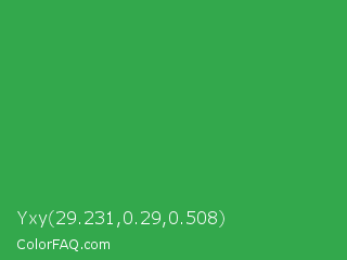 Yxy 29.231,0.29,0.508 Color is a normal green color and the nearest color is Chateau Green #40a860. Hex code #33a84c and RGB value is rgb(51,168,76). In RGB color space, this color is composed of 20% red, 66% green, 30% blue, In CMYK color space, this color is composed of 70% cyan, 0% magenta, 55% yellow , 34% black , In HSL color space, this color has a hue angle of 133° , 53% saturation and 43% lightness.