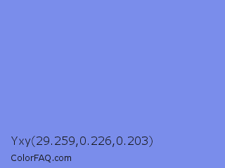 Yxy 29.259,0.226,0.203 Color is a light blue color and the nearest color is Cornflower Blue #6495ed. Hex code #7a8deb and RGB value is rgb(122,141,235). In RGB color space, this color is composed of 48% red, 55% green, 92% blue, In CMYK color space, this color is composed of 48% cyan, 40% magenta, 0% yellow , 8% black , In HSL color space, this color has a hue angle of 230° , 74% saturation and 70% lightness.