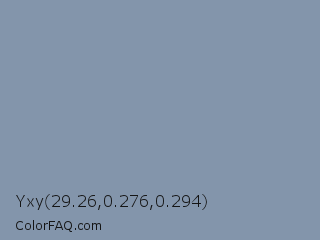 Yxy 29.26,0.276,0.294 Color is a normal blue color and the nearest color is Weldon Blue #7c98ab. Hex code #8395ab and RGB value is rgb(131,149,171). In RGB color space, this color is composed of 51% red, 58% green, 67% blue, In CMYK color space, this color is composed of 23% cyan, 13% magenta, 0% yellow , 33% black , In HSL color space, this color has a hue angle of 213° , 19% saturation and 59% lightness.