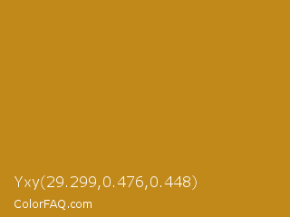 Yxy 29.299,0.476,0.448 Color is a normal orange color and the nearest color is Pizza #c99415. Hex code #c1891a and RGB value is rgb(193,137,26). In RGB color space, this color is composed of 76% red, 54% green, 10% blue, In CMYK color space, this color is composed of 0% cyan, 29% magenta, 87% yellow , 24% black , In HSL color space, this color has a hue angle of 40° , 76% saturation and 43% lightness.