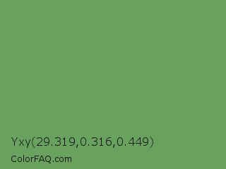 Yxy 29.319,0.316,0.449 Color is a normal green color and the nearest color is Russian Green #679267. Hex code #69a15f and RGB value is rgb(105,161,95). In RGB color space, this color is composed of 41% red, 63% green, 37% blue, In CMYK color space, this color is composed of 35% cyan, 0% magenta, 41% yellow , 37% black , In HSL color space, this color has a hue angle of 111° , 26% saturation and 50% lightness.