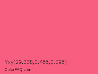 Yxy 29.338,0.466,0.296 Color is a light red color and the nearest color is Brink Pink #fb607f. Hex code #f75e80 and RGB value is rgb(247,94,128). In RGB color space, this color is composed of 97% red, 37% green, 50% blue, In CMYK color space, this color is composed of 0% cyan, 62% magenta, 48% yellow , 3% black , In HSL color space, this color has a hue angle of 347° , 91% saturation and 67% lightness.