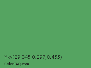 Yxy 29.345,0.297,0.455 Color is a normal green color and the nearest color is Fruit Salad #4f9d5d. Hex code #55a461 and RGB value is rgb(85,164,97). In RGB color space, this color is composed of 33% red, 64% green, 38% blue, In CMYK color space, this color is composed of 48% cyan, 0% magenta, 41% yellow , 36% black , In HSL color space, this color has a hue angle of 129° , 32% saturation and 49% lightness.