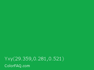 Yxy 29.359,0.281,0.521 Color is a normal green color and the nearest color is Green Pantone #00ad43. Hex code #12aa49 and RGB value is rgb(18,170,73). In RGB color space, this color is composed of 7% red, 67% green, 29% blue, In CMYK color space, this color is composed of 89% cyan, 0% magenta, 57% yellow , 33% black , In HSL color space, this color has a hue angle of 142° , 81% saturation and 37% lightness.