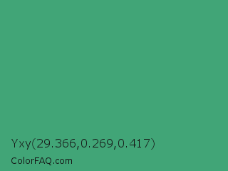 Yxy 29.366,0.269,0.417 Color is a normal green color and the nearest color is Ocean Green #41aa78. Hex code #41a577 and RGB value is rgb(65,165,119). In RGB color space, this color is composed of 25% red, 65% green, 47% blue, In CMYK color space, this color is composed of 61% cyan, 0% magenta, 28% yellow , 35% black , In HSL color space, this color has a hue angle of 152° , 43% saturation and 45% lightness.