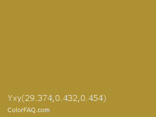 Yxy 29.374,0.432,0.454 Color is a normal yellow color and the nearest color is Alpine #af8f2c. Hex code #ad9133 and RGB value is rgb(173,145,51). In RGB color space, this color is composed of 68% red, 57% green, 20% blue, In CMYK color space, this color is composed of 0% cyan, 16% magenta, 71% yellow , 32% black , In HSL color space, this color has a hue angle of 46° , 54% saturation and 44% lightness.
