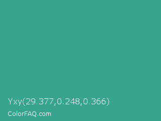 Yxy 29.377,0.248,0.366 Color is a normal cyan color and the nearest color is Zomp #39a78e. Hex code #38a490 and RGB value is rgb(56,164,144). In RGB color space, this color is composed of 22% red, 64% green, 56% blue, In CMYK color space, this color is composed of 66% cyan, 0% magenta, 12% yellow , 36% black , In HSL color space, this color has a hue angle of 169° , 49% saturation and 43% lightness.