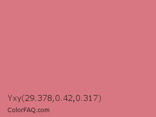 Yxy 29.378,0.42,0.317 Color is a light red color and the nearest color is New York Pink #d7837f. Hex code #d87781 and RGB value is rgb(216,119,129). In RGB color space, this color is composed of 85% red, 47% green, 51% blue, In CMYK color space, this color is composed of 0% cyan, 45% magenta, 40% yellow , 15% black , In HSL color space, this color has a hue angle of 354° , 55% saturation and 66% lightness.