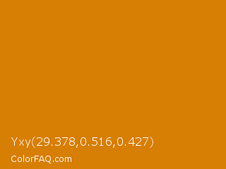 Yxy 29.378,0.516,0.427 Color is a normal orange color and the nearest color is Fulvous #e48400. Hex code #d77e04 and RGB value is rgb(215,126,4). In RGB color space, this color is composed of 84% red, 49% green, 2% blue, In CMYK color space, this color is composed of 0% cyan, 41% magenta, 98% yellow , 16% black , In HSL color space, this color has a hue angle of 35° , 96% saturation and 43% lightness.