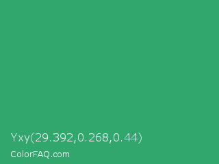 Yxy 29.392,0.268,0.44 Color is a normal green color and the nearest color is Medium Sea Green #3cb371. Hex code #31a76e and RGB value is rgb(49,167,110). In RGB color space, this color is composed of 19% red, 65% green, 43% blue, In CMYK color space, this color is composed of 71% cyan, 0% magenta, 34% yellow , 35% black , In HSL color space, this color has a hue angle of 151° , 55% saturation and 42% lightness.