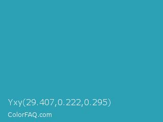 Yxy 29.407,0.222,0.295 Color is a normal cyan color and the nearest color is Eastern Blue #1e9ab0. Hex code #2ca1b5 and RGB value is rgb(44,161,181). In RGB color space, this color is composed of 17% red, 63% green, 71% blue, In CMYK color space, this color is composed of 76% cyan, 11% magenta, 0% yellow , 29% black , In HSL color space, this color has a hue angle of 189° , 61% saturation and 44% lightness.