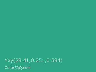 Yxy 29.41,0.251,0.394 Color is a normal cyan color and the nearest color is Jungle Green #29ab87. Hex code #2aa684 and RGB value is rgb(42,166,132). In RGB color space, this color is composed of 16% red, 65% green, 52% blue, In CMYK color space, this color is composed of 75% cyan, 0% magenta, 20% yellow , 35% black , In HSL color space, this color has a hue angle of 164° , 60% saturation and 41% lightness.