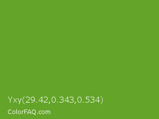 Yxy 29.42,0.343,0.534 Color is a normal green color and the nearest color is Green RYB #66b032. Hex code #64a429 and RGB value is rgb(100,164,41). In RGB color space, this color is composed of 39% red, 64% green, 16% blue, In CMYK color space, this color is composed of 39% cyan, 0% magenta, 75% yellow , 36% black , In HSL color space, this color has a hue angle of 91° , 60% saturation and 40% lightness.