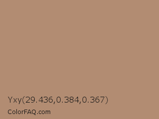 Yxy 29.436,0.384,0.367 Color is a normal orange color and the nearest color is Light Taupe #b38b6d. Hex code #b28c72 and RGB value is rgb(178,140,114). In RGB color space, this color is composed of 70% red, 55% green, 45% blue, In CMYK color space, this color is composed of 0% cyan, 21% magenta, 36% yellow , 30% black , In HSL color space, this color has a hue angle of 24° , 29% saturation and 57% lightness.