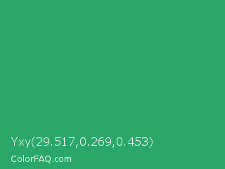 Yxy 29.517,0.269,0.453 Color is a normal green color and the nearest color is Green Crayola #1cac78. Hex code #2ba869 and RGB value is rgb(43,168,105). In RGB color space, this color is composed of 17% red, 66% green, 41% blue, In CMYK color space, this color is composed of 74% cyan, 0% magenta, 38% yellow , 34% black , In HSL color space, this color has a hue angle of 150° , 59% saturation and 41% lightness.