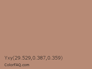 Yxy 29.529,0.387,0.359 Color is a normal orange color and the nearest color is Light Taupe #b38b6d. Hex code #b78a75 and RGB value is rgb(183,138,117). In RGB color space, this color is composed of 72% red, 54% green, 46% blue, In CMYK color space, this color is composed of 0% cyan, 25% magenta, 36% yellow , 28% black , In HSL color space, this color has a hue angle of 19° , 31% saturation and 59% lightness.
