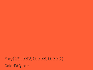 Yxy 29.532,0.558,0.359 Color is a light red color and the nearest color is Outrageous Orange Crayola #ff6037. Hex code #ff5e36 and RGB value is rgb(255,94,54). In RGB color space, this color is composed of 100% red, 37% green, 21% blue, In CMYK color space, this color is composed of 0% cyan, 63% magenta, 79% yellow , 0% black , In HSL color space, this color has a hue angle of 12° , 100% saturation and 61% lightness.